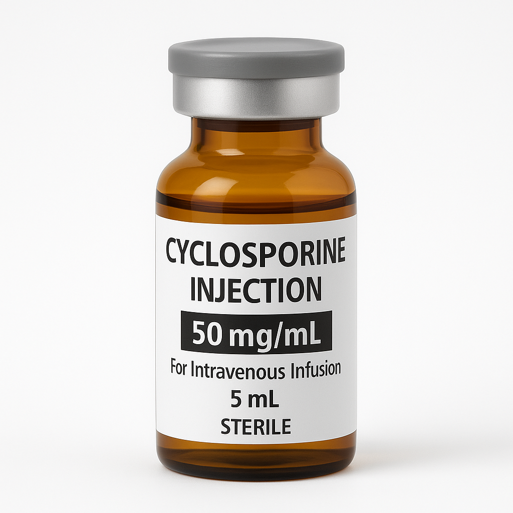 Cyclosporine Injection 50 mg/mL is a sterile solution of cyclosporine, designed for intravenous (IV) administration. The “50 mg/mL” indicates that each milliliter of the solution contains 50 milligrams of cyclosporine.1 It typically comes in ampoules or vials and is a concentrate that needs to be diluted before infusion.